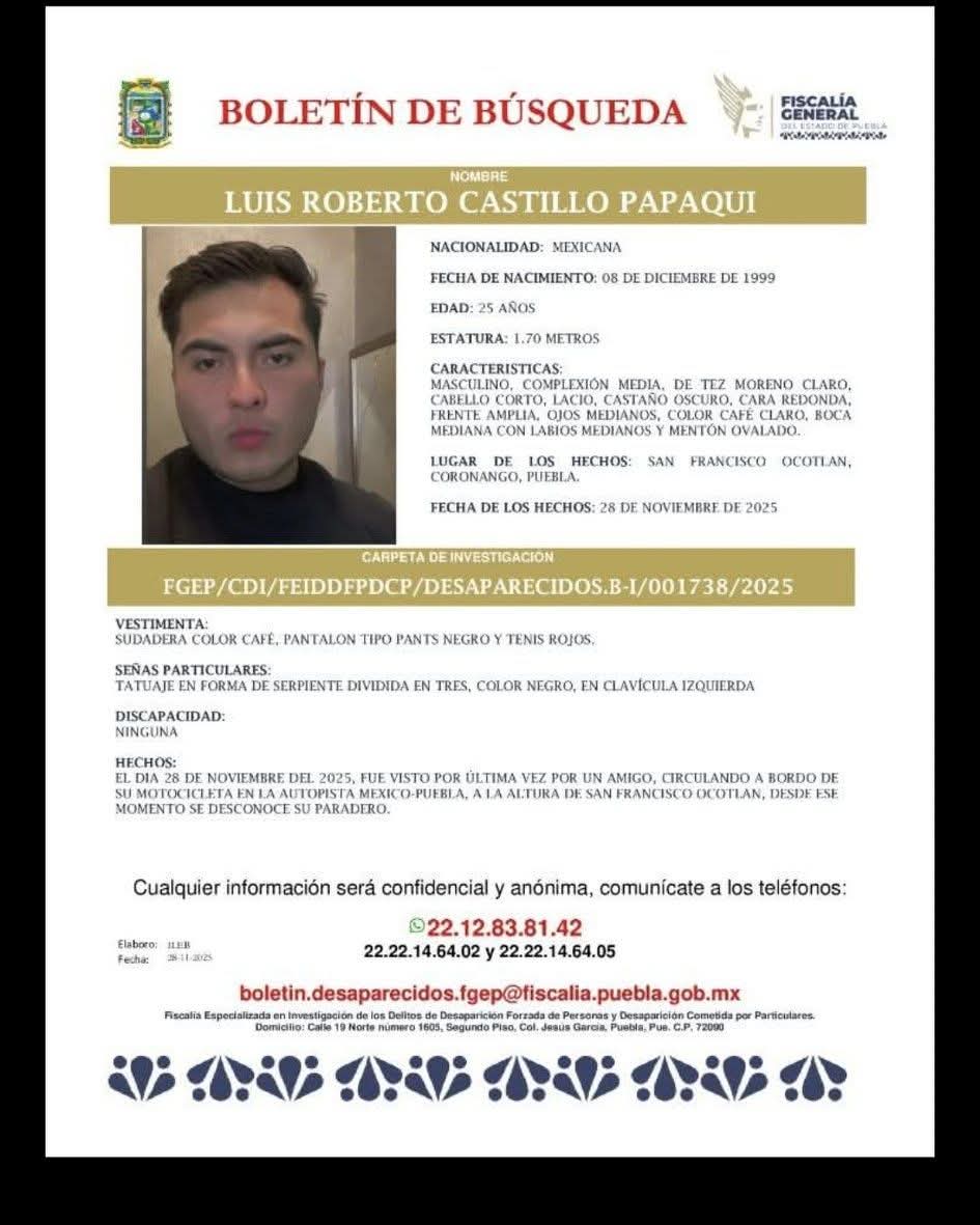 Coronango, Pue.- Familiares y amigos de Luis Roberto Castillo Papaqui , joven de 25 años , solicitan el apoyo de la ciudadanía para localizarlo luego de que desapareciera la madrugada del 28 de noviembre de 2025 tras sufrir un accidente en motocicleta sobre la autopista México–Puebla , a la altura del kilómetro 112+800 , en la zona de San Francisco Ocotlán , perteneciente a Coronango.